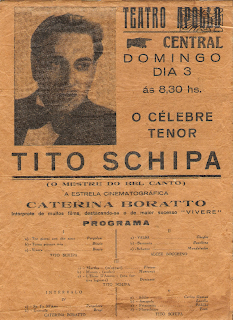Durante a II Guerra Mundial (1939-1945), muitas companhias de teatro e muitos artistas ficaram presos na América.Um dos exemplos foi Marguerite Youcenar "presa" nos Estados Unidos . Impedidas de voltar para a Europa os artistas procuravam aproveitar o tempo em apresentações em lugares que de outra forma não teriam chance de asssisti-los. Foi o que aconteceu na antiga Caxias do Sul. Entre os muitos artistas que por aqui passaram Tito Schipa (1888-1965) foi um dos mais importantes. Meus pais assitiram à apresentação e eu guardei o folheto de propaganda do espetáculo, graças à minha mãe que curtia a familia, e que uma acumuladora de fontes históricas.Observo que não há o ano de apresentação (1943). Durante a Guerra, os habitantes da região foram perseguidos e viviam num clima de medo ,não só por falarem outra língua , bem como o medo dos bombardeios nazistas. Que tempos ingênuos, onde os blecautes vigoravam todas as noites.